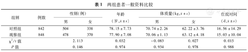 | 观察组 | 848 | 478 | 370 | 77.90±7.08 | 70.06±1.13 | 63.12±4.18 | 15.03±10.04 |