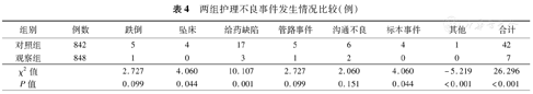 见表4。观察组发生护理不良事件总体情况低于对照组,差异有统计学意义(P<0.05)。