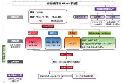 | 2.对于新诊断的T2DM患者,如生活方式干预不能使HbA1c达标,应及时启动药物治疗;单药治疗3个月HbA1c仍未达标,应及时进行联合治疗 |