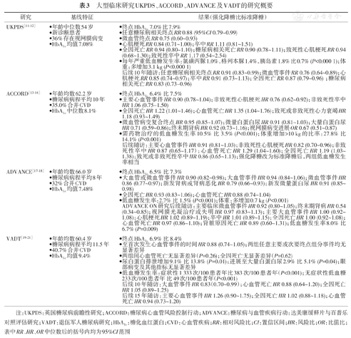 注:UKPDS:英国糖尿病前瞻性研究;ACCORD:糖尿病心血管风险控制行动;ADVANCE:糖尿病与血管疾病行动:达美康缓释片与百普乐对照评估研究;VADT:退伍军人糖尿病研究;HbA1c:糖化血红蛋白;CVD:心血管疾病;RR:相对风险比;CI:置信区间;HR:风险比;OR:比值比;表中RR、HR、OR中位数后的括号内均为95%CI范围
