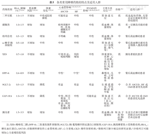 在选择降糖药物时,ADA倡导以患者为中心的理念,综合考虑并发症或合并症、低血糖风险、对体重的影响、治疗费用、不良反应风险、患者偏好等因素[5]。CDS强调根据药物疗效和安全性、卫生经济学等方面的临床证据以及我国国情等因素权衡考虑,选择合适的降糖药物[4]。各类降糖药物的特点和适用人群存在差异(表5),每一类降糖药物都有各自的优缺点,临床医师应熟悉各类药物的特点,根据患者的具体情况个体化地选择药物,以期达到最佳的获益/风险比。对于有低血糖风险的药物,应加强药物使用方法及注意事项相关知识的教育,以减少低血糖风险。