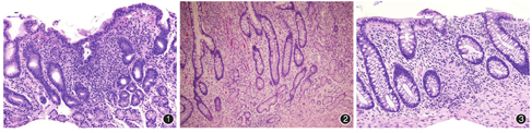 克罗恩病早期组织学改变主要为累及多个部位的局灶增强性炎症反应,在正常黏膜背景中出现慢性炎性细胞呈局灶性浸润、破坏单个或数个腺体。此时,隐窝尚未出现明显结构改变,内镜仅见红斑等轻微改变。局部增强性炎症反应常同时累及上下消化道多个部位,如胃、十二指肠、回肠、结肠等。多部位同时存在局部增强性炎症反应,这具有重要的克罗恩病诊断和鉴别诊断价值,也要求内镜必须系统性多点活检,病理医生才能观察到炎症反应呈多部位分布的特征。