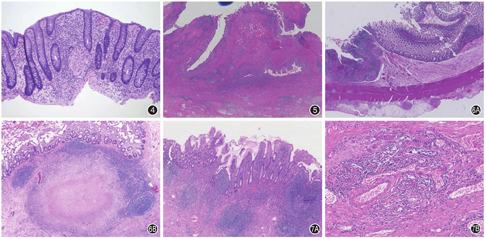 克罗恩病是以慢性炎性细胞破坏黏膜和肠壁组织为特征。黏膜以隐窝或表面上皮改变为核心,常表现为黏膜隐窝结构破坏(隐窝分支、不规则扩张、缩短、延长、缺失等)、小肠绒毛萎缩变平、化生性改变(幽门腺化生、杯状细胞增生、结肠脾曲以后的结直肠黏膜潘氏细胞化生);肠壁组织表现为透壁性、节段性分布的慢性炎症反应,受累部位肉芽肿数量相对较少;手术标本中可见的肉芽肿的数量与肠壁炎症反应及其继发的纤维组织增生等不成比例,炎症反应分布不以肉芽肿为中心(图5)。