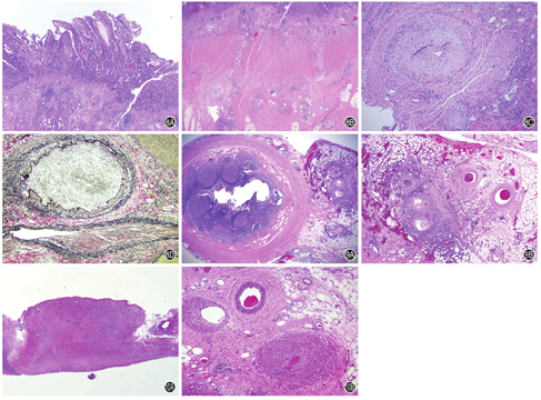1.动脉纤维平滑肌异生(fibromuscular dysplasia of artery,FMD)是一类病因不明的非炎性、非动脉粥样硬化性血管病,多见于青中年女性,通常累及肾和颈内动脉,但某些病例也发生于肠系膜或肠壁内血管,引起类似于克罗恩病的临床表现[8,9]。肠壁及肠系膜中等大小动脉内膜或中膜纤维平滑肌增生,血管腔狭窄以及逐渐闭塞。弹力纤维染色可显示血管壁弹力膜与内皮细胞间增宽,纤维组织增生(图8)。免疫组化SMA可显示血管壁或周围平滑肌增生紊乱。肠黏膜常表现为显著慢性肠炎,伴溃疡形成,溃疡较深时,肠壁可出现透壁性炎症反应及纤维化。