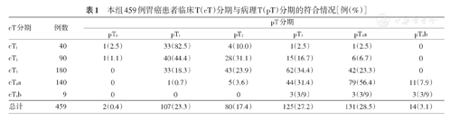 本组459例胃癌患者临床T(cT)分期与病理T(pT)分期的符合情况[例(%)]