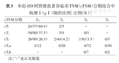 本组459例胃癌患者各临床TNM(cTNM)分期组合中病理Ⅰ(pⅠ)期的比例[比例(%)]
