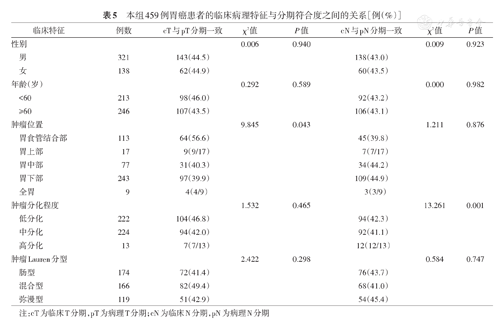 本研究459例患者中,肿瘤位置与cT/pT分期一致有关(χ2=9.845,P=0.043),肿瘤分化程度与cN/pN分期一致有关(χ2=13.261,P=0.001),差异均有统计学意义。Lauren分型与cT/pT分期及cN/pN分期是否符合之间关系的差异无统计学意义(均P>0.05)。见表5。