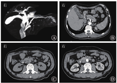 患者入院时精神可,食欲差,1个月内体质量下降5 kg。入院体格检查示上腹部轻压痛,无反跳痛、肌紧张;余未见异常。血常规、尿常规、粪常规、凝血功能指标,以及IL-6水平均在正常范围内,肿瘤标志物(癌胚抗原、CA19-9、甲胎蛋白)均未见异常。血生物化学检查示:ALT水平为64.3 U/L,DBil水平为10.7 μmol/L,GGT水平为193.6 U/L,淀粉酶、脂肪酶等均在正常范围内。2019年1月29日MRCP检查结果见胆总管下段近十二指肠乳头区可疑信号,考虑肿瘤性病变可能,伴胰胆管轻度扩张;2月1日腹部增强CT检查结果可见十二指肠乳头占位、胆管引流术后改变(图1)。