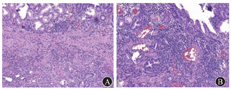 2019年1月30日行内镜下鼻胆外引流管变更内引流支架术(图2)。术后患者食欲改善,2周内体质量增加5 kg。2月11日患者出现发热,体温为37.7 ℃,上腹部疼痛,伴后背放射痛。查血常规未见异常,血生物化学检查示AST水平为88.2 U/L,胆红素水平在正常范围内,血淀粉酶水平为174.1 U/L(正常参考值为0~150.0 U/L ),血脂肪酶水平为352.7 U/L(正常参考值为13.0~60.0 U/L),不排除因乳头占位压迫胰管可能,予禁食水、对症支持治疗。2月13日行十二指肠乳头肿物内镜下切除术+超长胆胰管支架转流(鼻胆外引流管改造)术。术中先行超声内镜检查,初步评估乳头部占位无明显胆管、胰管内生性生长,但胰管扩张明显(图3)。考虑乳头病变浸润相对较深,为避免肿瘤组织残留或复发,切除乳头病变时尽量深切,术后创面可见固有肌层显露。为避免胰液或胆汁刺激创面而引起迟发出血或穿孔,术中置入鼻胆外引流管改造的超长(约35 cm)胆胰管支架转流,将胰液和胆汁跨过乳头切除创面引流至远端空肠,创面予金属夹夹闭(图4)。术后病理结果(图5)提示十二指肠乳头壶腹部低分化腺癌,癌旁和表浅腺体呈管状-绒毛状腺瘤改变,癌灶大小约1.5 cm×1.0 cm×0.5 cm,癌组织侵犯十二指肠肠壁肌层,紧邻基底切缘(切缘电凝变性显著)。术后当天和第2天胃管内共引流出约220 mL血性液体,发热,体温最高38.5 ℃,右上腹疼痛,查体无腹膜刺激征。复查血红蛋白较前无明显下降,白细胞计数为9.17×109/L,中性粒细胞占比为0.81,IL-6水平为80.4 ng/L,血淀粉酶水平为183.3 U/L,血脂肪酶水平为292.26 U/L,余未见明显异常。予以禁食水、抗感染(静脉注射亚胺培南西司他丁钠,1 g/8 h)、止血(经静脉泵注射艾司奥美拉唑、生长抑素,静脉注射酚磺乙胺、卡洛磺钠,口服凝血酶冻干粉等)、静脉营养支持等治疗。患者胃管内出血逐渐停止,腹痛渐缓解,1周后拔除胃管,逐步恢复饮食。患者于2019年5月31日至解放军总医院第一医学中心复查,十二指肠检查结果未见异常,活组织病理学检查示慢性炎,正电子发射计算机断层显像(PET-CT)检查未见明确肿瘤残留、复发或远处移位。2019年10月外院复查腹部增强CT亦未见明显异常。遂继续随访观察至今,患者无明显不适。