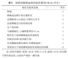 在静脉超声检查前,可采用Wells DVT评分进行初步评估,根据结果分为低度、中度、高度DVT可能性[51](表5)。如超声检查为阴性,对于低、中度可能的患者可以排除诊断,而对于高度可能的患者建议做血管造影等影像学检查。