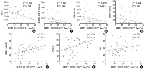 注:T-25(OH)D:总25羟维生素D;CDAI:克罗恩病活动指数;IL:白细胞介素;ESR:红细胞沉降率;hsCRP:超敏C反应蛋白;Alb:血清白蛋白;Hb:血红蛋白;BMI:体质指数