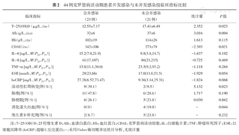44例克罗恩病活动期患者并发感染与未并发感染组临床指标比较