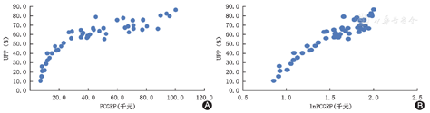 以PCGRP为横坐标,UPP为纵坐标,其散点图见图1A;以lnPCGRP为横坐标,UPP为纵坐标,其散点图见图1B。图1A可见,随着PCGRP的增加,UPP也增加,但PCGRP值低时,UPP上升的比较快,呈现一个指数上升的趋势,而非线性。将PCGRP取自然对数后,图1B可见,lnPCGRP与UPP呈现一个线性增加的趋势,即正相关关系。
