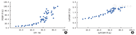 例2:上述例1资料,以UPP为自变量,PCGRP为因变量,进行线性回归分析。以UPP为横坐标,PCGRP为纵坐标,其散点图如图2A;以UPP为横坐标,lnPCGRP为纵坐标,其散点图如图2B。图2A可见,随着UPP的增加,PCGRP也增加,但UPP值高时,PCGRP上升的比较快,呈现一个指数上升的趋势,而非线性。将PCGRP取自然对数后,图2B可见,UPP与lnPCGRP呈现一个线性增加的趋势,即正相关关系。