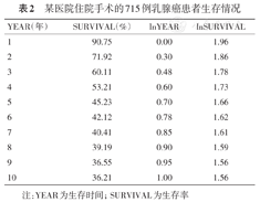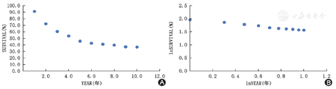 根据表2中的数据,以YEAR为横坐标,SURVIVAL为纵坐标,其散点图见图3A;以lnYEAR为横坐标,lnSURVIVAL为纵坐标,其散点图见图3B。图3A可见,SURVIVAL呈指数下降,将术后YEAR和SURVIVAL都取自然对数后,lnYEAR与lnSURVIVAL呈现一个线性下降的趋势(图3B)。这种情况在生存率分析中常见,称为二次对数生存曲线图(LLS),可用来判断Cox比例风险模型的等比例假设。