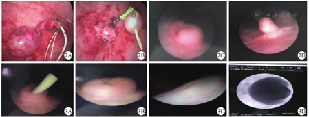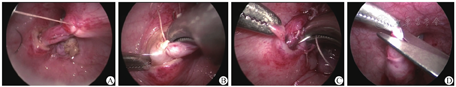 先将患侧输尿管悬吊于对侧膀胱壁或者直接从腹壁外刺入针线悬吊,牵引输尿管,显露更加清晰(图1A)。用5-0可吸收线间断缝合输尿管浆肌层与膀胱浆肌层,固定点在输尿管开口近端4~5 cm处,一般缝合4~6针(图1B);然后再距此吻合处远端1.0~1.5 cm缝合输尿管浆肌层与膀胱黏膜层,使输尿管包埋在膀胱壁内1.0~1.5 cm(图1C);然后剪去输尿管末端病变(图1D),使输尿管游离、旷置于膀胱内2.0~2.5 cm,走行方向顺原先输尿管走行,并将游离输尿管后壁与膀胱黏膜缝合2针固定。