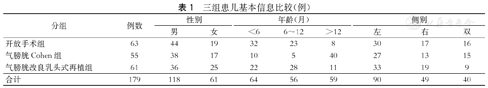 179例患儿,男118例,女61例。年龄1个月至10岁3个月。按采用手术方法的不同分为三组。