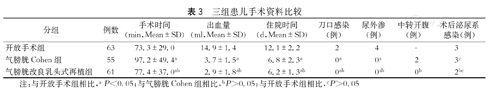 注:与开放手术组相比,aP<0.05;与气膀胱Cohen组相比,bP>0.05;与开放手术组相比,cP>0.05