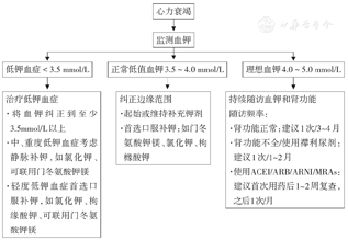 (1)低钾血症(血钾<3.5 mmol/L)治疗原则:预防、治疗危及生命的并发症,如心律失常、呼吸肌麻痹等;纠正低钾血症,将血钾纠正至>3.5 mmol/L;诊断、治疗原发病。①轻度低钾血症(血钾3.0~3.5 mmol/L)推荐首选口服补钾,中重度低钾血症(血钾<3.0 mmol/L)应考虑静脉补钾;可同时联合门冬氨酸钾镁以促进钾离子的转运和跨膜平衡。②口服补钾初始剂量为60~80 mmol/d,分次服用,通常一次口服氯化钾3.0~4.5 g,可使血钾上升1.0~1.5 mmol/L[23]。③一般静脉补钾浓度为20~40 mmol/L,相当于1.5~3.0 g/L。心衰患者输液速度不宜过快,液体总量不宜过多,可考虑静脉泵入。高浓度的钾溶液必须经大静脉如颈内静脉、锁骨下静脉或股静脉输入[1,23]。④密切监测血钾水平,建议血钾补至>4.0 mmol/L。