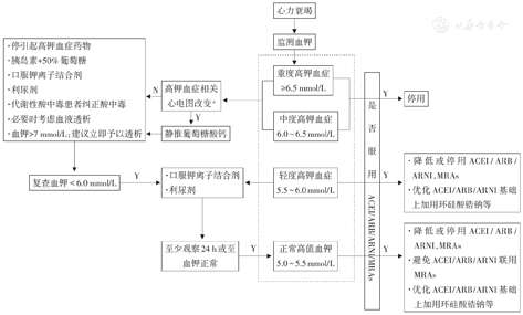 限制钾含量较高的食物摄入,如水果、蔬菜等[25],减量或停用钾补充剂、RAASi、MRAs等药物。