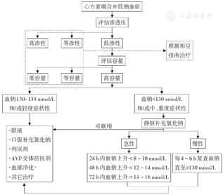 初始治疗要通过评估血浆渗透压来区分"真正的"低钠血症和假性低钠血症,假性低钠血症在纠正高血糖、高甘油三酯、高免疫球蛋白等原因后,低钠血症也会随之纠正,预后较好。真正的低钠血症要进一步评估患者容量状态,心衰中最常见的为高容量低渗性低钠血症,治疗包括限液、补充氯化钠、利尿、使用AVP受体拮抗剂、连续性血液净化等。