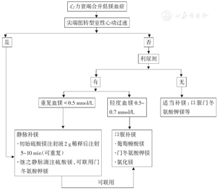 纠正心衰患者的低镁血症,应首先寻找并处理病因。根据低镁血症的病因、症状、严重程度以及伴随的其他电解质紊乱等因素调整补充镁剂的类型、途径和积极性[67]。纠正低镁血症能否带来良好预后,结论尚不明确[68],心衰或重症患者的镁剂补充应持相对谨慎态度。心衰患者发生尖端扭转型室性心动过速时,静脉应用硫酸镁是有效的终止方法,建议血镁维持在≥2.0 mmol/L,血钾维持在4.5~5.0 mmol/L[18,69],与尖端扭转型室性心动过速无关的难治性心室颤动,静脉使用镁剂无益处。