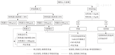 (1)单纯铁缺乏的处理:不合并贫血的单纯铁缺乏心衰患者直接开始补铁治疗,补铁量、制剂选择和应用方法同前。(2)同时合并铁缺乏和贫血的处理:心衰同时合并铁缺乏和贫血(即缺铁性贫血)者,还应筛查其他引起血红蛋白下降的原因。缺铁性贫血患者应根据贫血病因给与相应治疗并积极补铁,治疗原则和方法同前。
