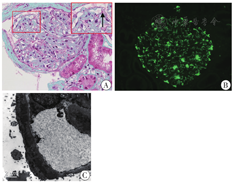 注:A:箭头示肾小球上皮侧嗜复红物沉积,节段袢"钉突"形成(Masson ×400);B:磷脂酶A2受体荧光染色(免疫荧光 ×400);C:肾小球上皮侧"钉突"形成(电镜 ×10 000)