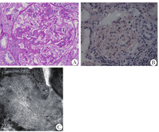 芬兰型淀粉样变性1969年由芬兰眼科医生Meretoja[10]首先提出,好发于芬兰地区,此外欧洲、北美、南美、亚洲也有报道,典型表现为颅神经病变、格子状角膜营养不良及皮肤松弛症[3]。此外,该病还可以累及周围神经、肌肉、心脏导致相应组织器官损害,累及肾脏罕见。该病好发于25~30岁,以格子状角膜营养不良起病,随着年龄的增长,逐渐出现颅神经病变及皮肤松弛症。纯合型比杂合型发病年龄更早,且病变更严重。芬兰型肾淀粉样变性罕见[3]。Sethi等[11]统计12例芬兰型肾淀粉样变性,平均诊断年龄63.8岁,临床表现为肾病综合征,进展性肾功能不全。光镜下肾淀粉样物质主要位于肾小球,只有1例同时累及肾间质,所有患者无肾血管及肾髓质受累。电镜下淀粉样纤维丝可呈无规则、平行板状、漩涡状及束状排列,为其特征性改变。芬兰型肾淀粉样变性亦可以少到中等量蛋白尿起病[3]。本例中年女性患者,以肾病综合征起病,伴肾功能异常,未见肾外受累,基因检测提示杂合型突变。肾组织淀粉样物质沉积在肾小球及肾间质,无血管受累,电镜下可见淀粉样物呈漩涡状排列,与文献报道一致。