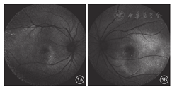 患者女,26岁。因左眼视物变形1个月于2018年9月17日到上海和平眼科医院就诊。患者3年前于外院诊断为"双眼闭角型青光眼",并行双眼YAG激光虹膜周边切除手术。否认家族遗传病史,其母视力及眼底检查正常,其父视力正常。10多岁时发现夜盲。患者一般情况良好。眼科检查:右眼视力1.0;左眼视力0.6,矫正不能提高。双眼屈光度均为+0.5 DS。右眼、左眼眼压分别为30、28 mmHg (1 mmHg=0.133 kPa)。双眼眼轴长度均为21 mm。双眼眼前节正常,前房浅,上方虹膜周切口通畅。晶状体透明,玻璃体不混浊。双眼视盘边界清楚,C/D为0.8;视网膜血管未见明显异常。双眼视网膜后极部不均匀黄白色物质沉积,黄斑中心凹反光消失(图1)。频域OCT (SD-OCT)检查,右眼内核层层间劈裂,外界膜下椭圆体带、光感受器外节大量强反射物质沉积,RPE/Bruch膜上锥形强反射物质沉积,两层强反射之间有弱反射暗区(空腔);左眼黄斑中心凹RPE下强反射隆起,Bruch膜断裂(图2)。OCT血管成像(OCTA)检查,右眼脉络膜毛细血管层大片血流信号遮蔽成暗区,其内及边缘见小片状非血流信号团;左眼无脉管层暗区内见线团状异常血流信号团(图3)。FFA检查,右眼黄斑中心凹旁斑片状强荧光,晚期染色;左眼晚期黄斑鼻下方三角形强荧光素渗漏(图4)。FAF检查,双眼后极部斑点状环形强荧光,累及颞侧及下方视网膜(图5)。EOG检查,双眼光峰值降低或消失,右眼、左眼Arden比值分别为1.2、1.1。诊断:双眼常染色体隐性卵黄样黄斑营养不良(ARB );左眼脉络膜新生血管(CNV)。患者于复旦大学附属眼耳鼻喉科医院行基因检测,提示BEST1基因杂合突变,突变位点c.140G> A,氨基酸变化p.R47H。给予双眼降眼压药物治疗;左眼玻璃体腔注射雷珠单抗治疗,每月1次,连续3次。左眼第1次注射后,患者诉视物变形症状消失;视力1.0。随访至今无变化。
