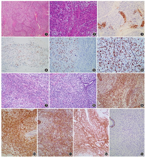 恶性叶状肿瘤的鉴别诊断主要是化生性梭形细胞癌。与化生性癌一样,恶性叶状肿瘤中的梭形细胞具有多形性、丰富的核分裂象,而且都可出现恶性异源性成分。这时,充分取材发现肿瘤中由腺上皮和肌上皮构成的双层上皮成分或叶片状结构是诊断恶性叶状肿瘤的关键之一。其次,CK、p63阴性,不表达特异性肉瘤标志物,对叶状肿瘤的诊断也具有重要作用。β-catenin核阳性是纤维瘤病和叶状肿瘤的共同特征[4],但在化生性癌中少见表达。约75%叶状肿瘤CD34阳性,但CD34随着叶状肿瘤级别增高表达减弱[5]。CD10、p53、CD117、EGFR在叶状肿瘤中都不同程度阳性,而且随着叶状肿瘤级别增高而表达增强。虽然p63、p40、CK阳性是诊断梭形细胞癌的重要依据,也有研究观察到p63、p40、CK在部分恶性叶状肿瘤中灶状阳性[6]。因此,单一的标志物不能很好帮助鉴别诊断,只有使用一组免疫组织化学指标,结合形态学才能提高诊断准确率。我们遇到的5例恶性叶状肿瘤,bcl-2、CD34、β-catenin、CD10都呈不同程度阳性(图9,图10,图11,图12),CKpan、p63均阴性(图13)。我们认为,bcl-2、CD34、β-catenin、CD10阳性有助于恶性叶状肿瘤诊断;而CK、p63、p40阳性有助于梭形细胞癌诊断。恶性叶状肿瘤与梭形细胞癌的治疗方案有所不同,鉴别诊断具有临床意义。恶性叶状肿瘤一般选择肿块完整切除,而不推荐常规前哨淋巴结清扫。手术后放化疗的作用尚不确定。但梭形细胞癌的治疗常需要新辅助化疗或化疗,外科手术包括前哨淋巴结切除[7]。