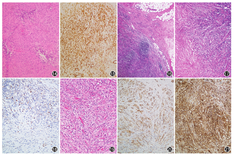 乳腺原发的具有温和形态特征梭形细胞病变还包括:结节性筋膜炎、活检后反应性梭形细胞结节、假血管瘤样间质增生、肌纤维母细胞瘤、炎性肌纤维母细胞瘤、韧带样型纤维瘤病、神经鞘瘤、平滑肌瘤、梭形细胞脂肪瘤、孤立性纤维性肿瘤、黏液瘤等[12]。其中乳腺结节性筋膜炎、反应性梭形细胞结节、炎性肌纤维母细胞瘤及肌纤维母细胞瘤都是纤维母细胞/肌纤维母细胞增生性病变;前3种病变具有相似的在形态学及免疫组织化学染色特征,都不同程度表达α-SMA和calponin,造成鉴别诊断困难。这时临床信息对鉴别诊断有较大的帮助,如乳腺穿刺病史有助于反应性梭形细胞结节的诊断;而伴有疼痛、生长迅速的结节有助于结节性筋膜炎的诊断。镜下,丰富的黏液样间质、较多的生理性核分裂象及肉芽样组织结构支持结节性筋膜炎的诊断;而较多的浆细胞浸润及梭形细胞间变性淋巴瘤激酶阳性则支持炎性肌纤维母细胞瘤的诊断。肌纤维母细胞瘤的组织形态变化较多,但其免疫组织化学染色颇具特征。