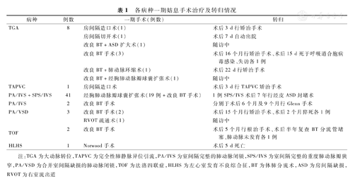 注:TGA为大动脉转位,TAPVC为完全性肺静脉异位引流,PA/IVS为室间隔完整的肺动脉闭锁,SPS/IVS为室间隔完整的重度肺动脉瓣狭窄,PA/VSD为合并室间隔缺损的肺动脉闭锁,TOF为法洛四联症,HLHS为左心室发育不良综合征,BT为体肺分流术,ASD为房间隔缺损,RVOT为右室流出道