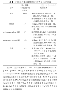 | 其他 | 3/2 | 医院内:DORV、DORV/CoA、DORV/IAA低心排血量综合征各1例;随访期间:DORV术后3个月多器官功能衰竭、PA/VSD一期行改良BT术后2年猝死各1例 |