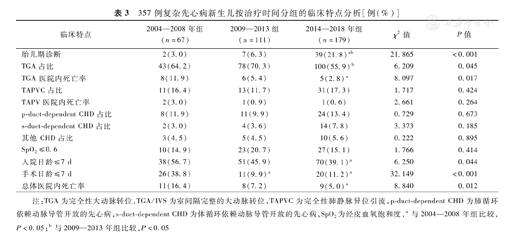 注:TGA为完全性大动脉转位,TGA/IVS为室间隔完整的大动脉转位,TAPVC为完全性肺静脉异位引流,p-duct-dependent CHD为肺循环依赖动脉导管开放的先心病,s-duct-dependent CHD为体循环依赖动脉导管开放的先心病,SpO2为经皮血氧饱和度,a与2004—2008年组比较,P<0.05;b与2009—2013年组比较,P<0.05