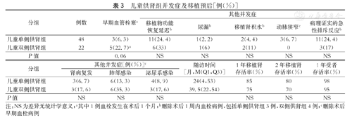 | 儿童单侧供肾组 | 48 | 3(6.3) | 11(24.4) | 1(2.2) | 2(4.4) | 3(6.7) | 11(24.4) |