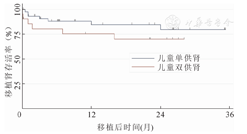 总的来说,本组儿童供肾移植的临床效果并不十分理想,儿童单侧供肾的2年存活率为80%,双侧供肾为70%,显著低于儿童受者接受成人供肾的存活率(97.2%),也显著低于本中心既往报道的成人受者接受儿童单侧供肾移植存活率[6,7]。当然因随访时间长短不一、跨度较大而可能存在存活率比较上的一定偏倚,但还是反映了总体情况。由于儿童接受儿童供肾移植尚处于早期起步阶段,难免有很多探索性的工作,包括供者年龄下限的探索、极低龄儿童受者肾移植的尝试、以及单/双侧肾选择标准的摸索等,因而可能影响了本组病例的总体移植肾存活效果。在未来,更多地选择1岁以上儿童供者实施单侧肾移植,选择3月龄至1岁之间的儿童供者双侧肾移植给大龄儿童,能有效减少并发症风险及显著提高移植肾存活率[8,9,10]。此外,在分配和选择受者时还需要综合考虑供者的体重、肾脏大小及血管条件等重要因素[11]。还要重视儿童供肾质量及儿童受者原发病的评估,并加强急性排斥反应的防治及儿童受者的依从性,相信下一阶段儿童肾移植的临床效果会越来越好。