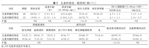 | 儿童双侧供肾组 | 22 | 13(59.1) | 11.5± 1.8 | 0.5(0.1,2) | 16(72.7) | 0 | 4.1± 1.1 | 1.4± 0.7 |