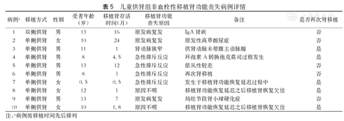 | 10 | 单侧供肾 | 女 | 10 | 1.8 | 原因不明 | 移植肾功能恢复延迟之后移植肾恢复欠佳 | 是 |