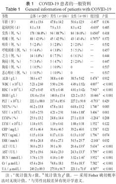 采用回顾性研究方法,纳入2020年1月24日至2月12日于湖北省孝感市汉川市人民医院欢乐街院区确诊COVID-19的住院患者,共计205例,采集入院时的一般资料、症状和各临床参数指标。纳入标准:符合国家卫生健康委办公厅发布的新型冠状病毒感染的肺炎诊疗方案(试行第五版)标准[5],所有患者均经采集咽拭子标本行荧光RT-PCR检测新型冠状病毒且结果为阳性。排除标准:急慢性肝炎、肝硬化、慢性肾病、急慢性胰腺炎、糖尿病、高血压病、冠状动脉粥样硬化性心脏病、恶性肿瘤或其他慢性消耗性疾病、胃肠道手术术后状态、妊娠期或哺乳期女性、毒麻药和精神类药物使用者。本研究经重庆大学附属中心医院/重庆市急救医疗中心伦理委员会批准(批件号:2020年伦审第(1)号),免患者知情同意书,符合国家卫健委规定及《赫尔辛基宣言》,我们的发现有助于为新冠肺炎的治疗策略提供依据。