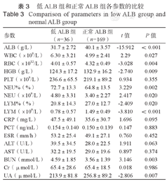 低ALB组和正常ALB组各参数的比较