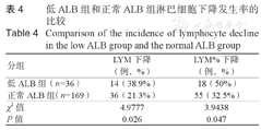 低ALB组中14例LYM下降(LYM<0.8×109/L),18例LYM%下降(LYM%<20%);正常ALB组中36例LYM下降,55例LYM%下降;低ALB组的LYM下降率、LYM%下降率均显著高于正常ALB组(P<0.05)。见表4。