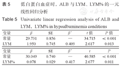 在低ALB组中,以ALB为自变量,分别以LYM、LYM%为因变量,行一元线性回归分析显示:ALB浓度与与LYM(β’=0.409,P=0.013)、LYM%(β’=0.417,P=0.011)水平呈显著正相关。见表5。