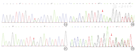 高通量基因测序结果显示,10例患儿中6例存在ANK1、2例(兄弟)存在SPTA1、1例存在SPTB基因突变,1例SPTB基因2~3号外显子疑似重复。其中,ANK1基因c.4585C>T(p.R1529X)、c.3877C>T(p.R1293X)突变在HGMD专业版已有文献报道与球形红细胞增多症(spherocytosis)相关;ANK1基因c.1471C>T(p.Q491X)、c.1817delT(p.L606Cfs*31)、c.4390+5G>T(IVS36dsG-T+5)、c.4189C>T(p.L1397F)突变未见文献报道。根据ACMG指南,ANK1基因c.1471C>T(p.Q491X)(图1A)、考虑c.1817delT(p.L606Cfs*31)突变(图1B)为新发可疑致病突变。SPTA1基因c.4766G>A(p.W1589X)、c.5432G>A(p.R1811Q)突变,SPTB基因2~3号外显子疑似重复未见文献报道。其中,考虑SPTA1基因c.4766G>A(p.W1589X)突变(图1C)为新发可疑致病突变。SPTB基因c.4735C>T(p.R1579X)突变已有文献报道。SPTB基因c.797_798del(p.I266Nfs*28)突变(图1D)未见文献报道,并且考虑为新发可疑致病突变。本研究10例HS患儿检出的基因突变,见表1。