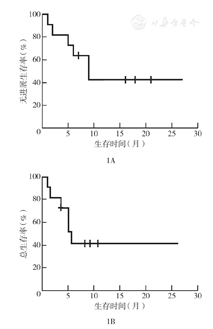 全组患者中位随访11个月(2~51个月),2年PFS率为42.4%,OS率为41.6%(图1)。截至随访结束,11例可评价疗效的患者中8例死亡,其中6例死于肿瘤进展,1例因肺部感染死亡,1例因脑出血死亡。