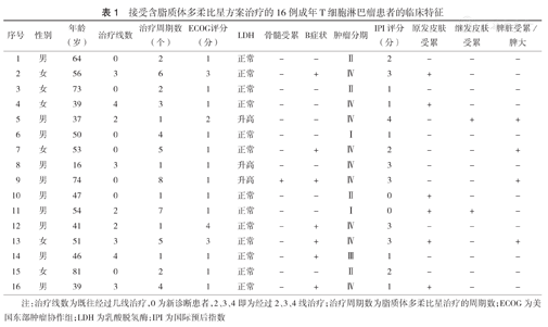 接受含脂质体多柔比星方案治疗的16例成年T细胞淋巴瘤患者的临床特征