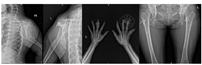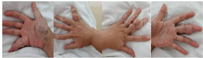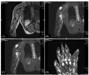 体格检查:身高:150 cm,体重:44 kg,体重指数17.4 kg/m2,脊柱无畸形,棘突无压痛,无叩痛,四肢活动正常。右肩关节、肱骨及双手指关节附近可见不规则隆起,质地硬,无压痛。右手大鱼际处可见肿胀,呈蓝色,质地软,无搏动感,无震颤,皮温正常,压痛(+),余无明显畸形(图1)。