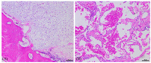 本病的诊断需结合临床表现,主要依据活检病理组织,发现同时存在软骨瘤及血管瘤,同时病变部位X线检查,对诊断Maffucci综合征至关重要。X线可见边界清晰的可透射线的骨骼损伤及受累骨骼皮质变薄和骨内膜扇贝样变[14]。周围软组织可有多处小钙化,提示有静脉石形成。当怀疑是恶性变时,应进行活检以明确诊断。而磁共振成像(MRI)扫描有助于减少因肿瘤异质性引起的采样误差[15]。