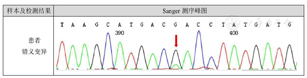 X线检查:双侧肩胛骨、双侧肱骨近段(图2)、右侧第2、5、6前肋、双侧股骨上段及左侧股骨下端(图2)、左胫骨、右侧尺桡骨远段、右手多发掌指骨、左侧第3、4掌指骨见多发骨密度减低,部分呈膨胀性骨质破坏。左侧第3指骨、右侧掌骨周围软组织内见斑点状钙化灶,双侧手指畸形改变(图2),右肱骨缩短畸形,左侧胫骨局部骨质扭曲。右上肢及右手磁共振平扫增强:右侧肩胛骨、右侧肱骨(图3A及图3B)、右侧桡骨中远段、右侧尺骨内侧远端(图3C)右手多发掌指骨、部分腕骨内可见弥漫多发不规则团状、结节状长T1长T2信号灶,部分呈膨胀性骨质破坏,部分掌指及指间关节部分畸形,邻近软组织肿胀、受累,增强后可见明显强化(图3D)。右手大鱼际处超声:皮下软组织层可探及多个低回声结节,形态欠规则,边界欠清,内光点粗,分布欠均匀,结节内可见大小不等的强光团伴声影。与患者及家属协商后在全麻下行右手软组织肿块活检术及右小指肿瘤活检术,病检结果为(右小指肿瘤)骨软骨瘤(图4A)及(右手肿块)血管瘤(图4B),Sanger测序法检测切除的软骨及血管标本中的异柠檬酸脱氢酶(IDH)基因是否有突变,结果发现IDH1 R132C突变(图5)。