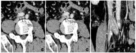 在平行于下腔静脉长径所建冠状面上测量夹角(α),要求显示下腔静脉和两侧髂总静脉及其汇合处(图1C)。